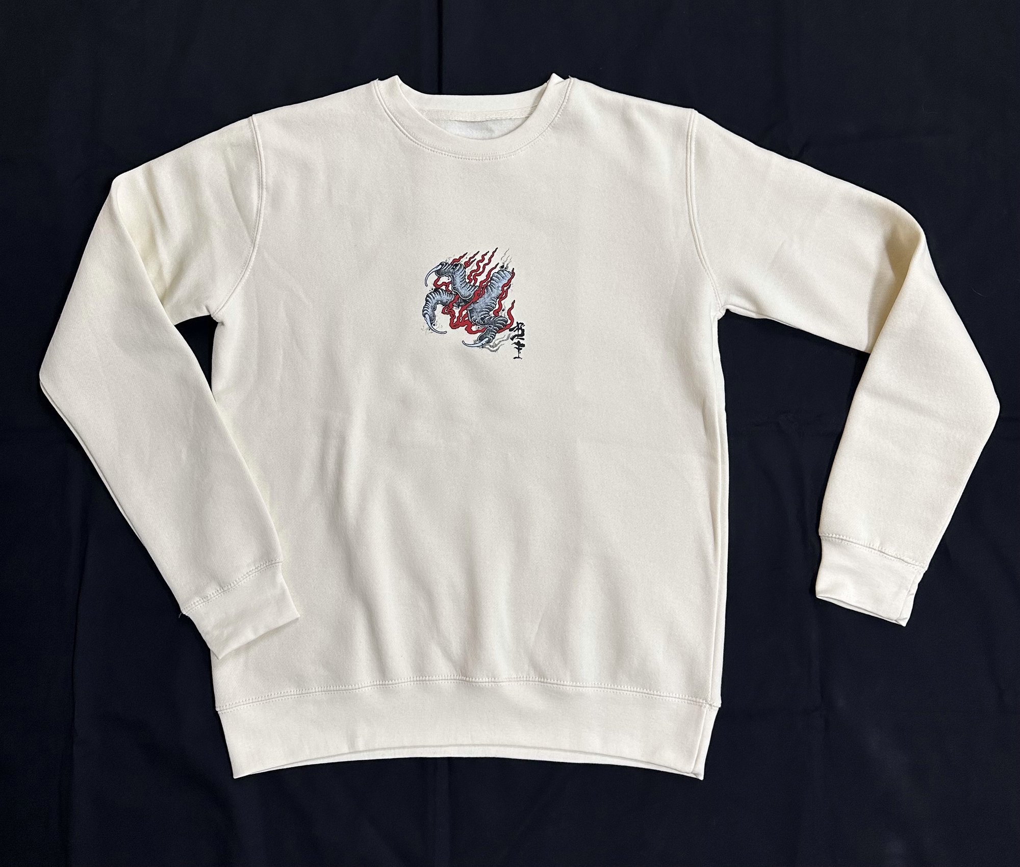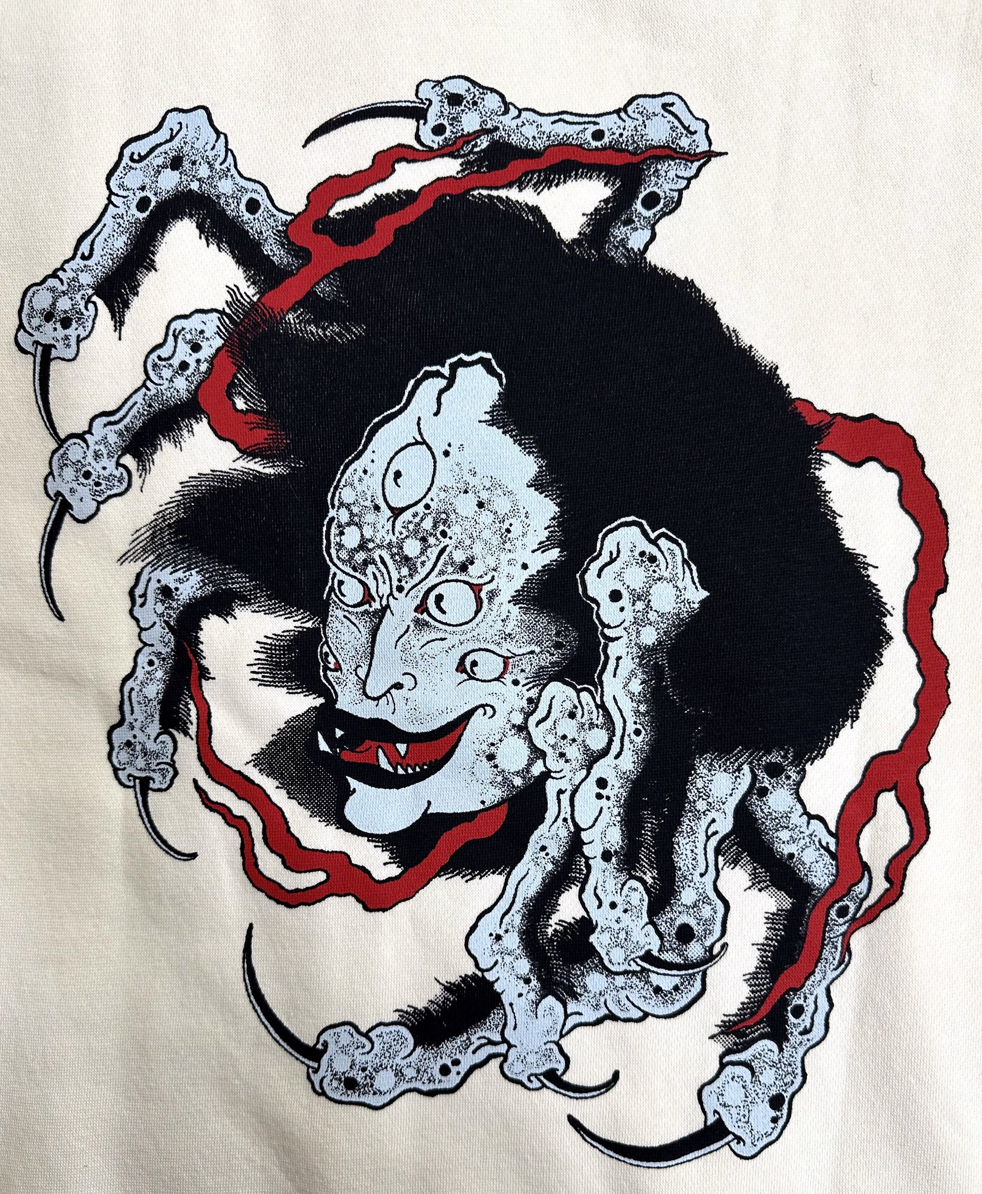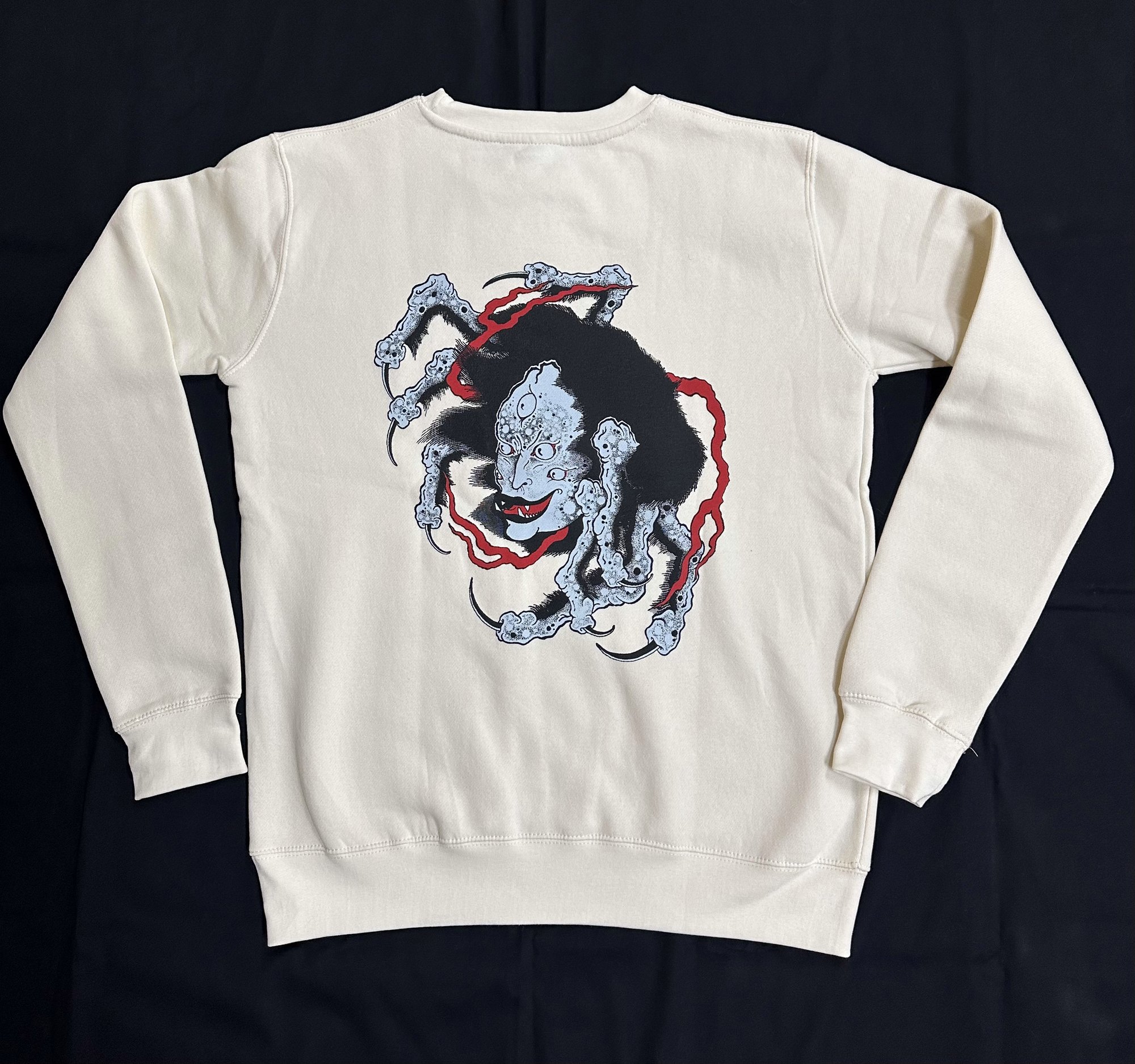 Jorogumo spider woman design by artist Virgo. Three colors screen print on the front and three colors big print on the back. Printed on off-white premium crewneck - 70% cotton 30% polyester, brushed back fleece.